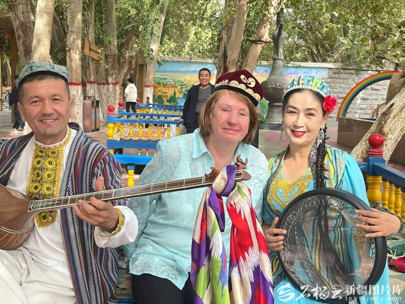 金秋十月,新疆风光如画,迎来八方游客。10月3日,吐鲁番葡萄沟景区内,澳大利亚80岁的游客麦迪娜沉醉于木卡姆的悠扬旋律中,随后在导游祖力菲亚·艾买提的陪伴下,启程前往乌鲁木齐。