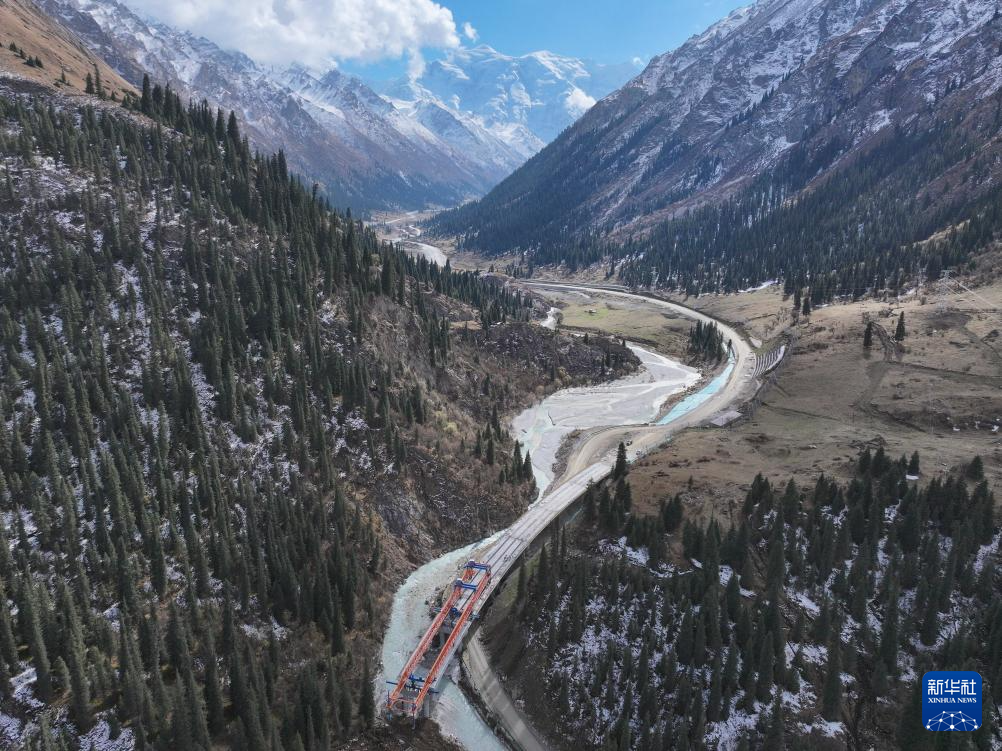 这是10月5日在新疆昭苏县拍摄的昭温公路西天山特长隧道进口端及附近施工现场(无人机照片)。该隧道为全线关键控制性工程,全长15.707千米,由北向南穿越天山山脉。